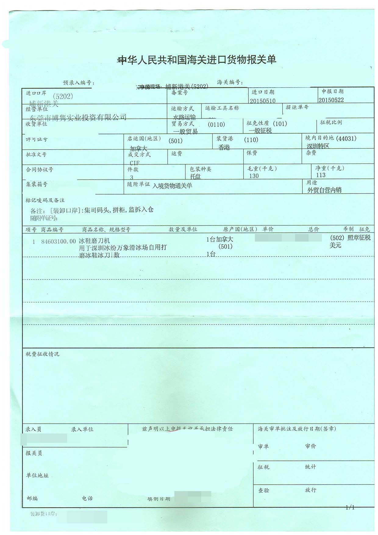 三、冰鞋磨刀機進口報關案例展示