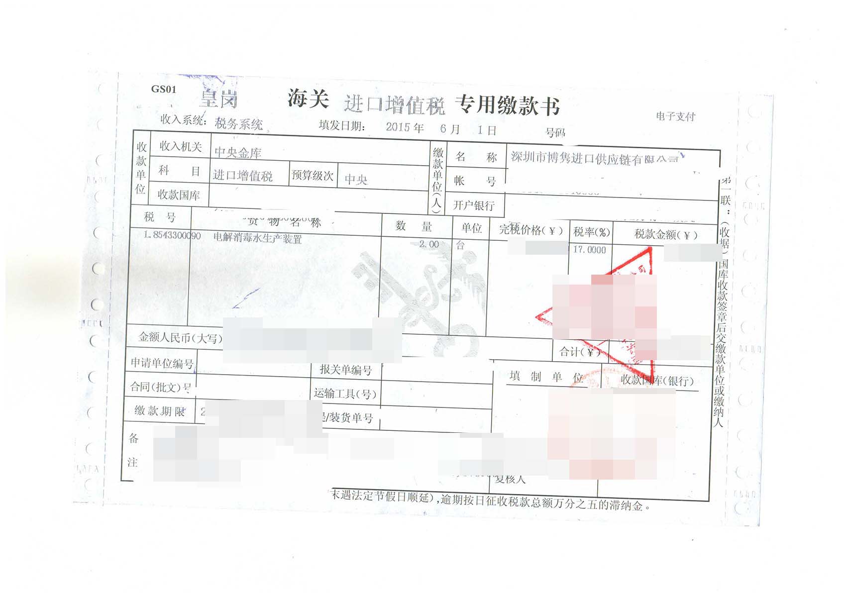 三、電解消毒水生產裝置進口報關案例展示