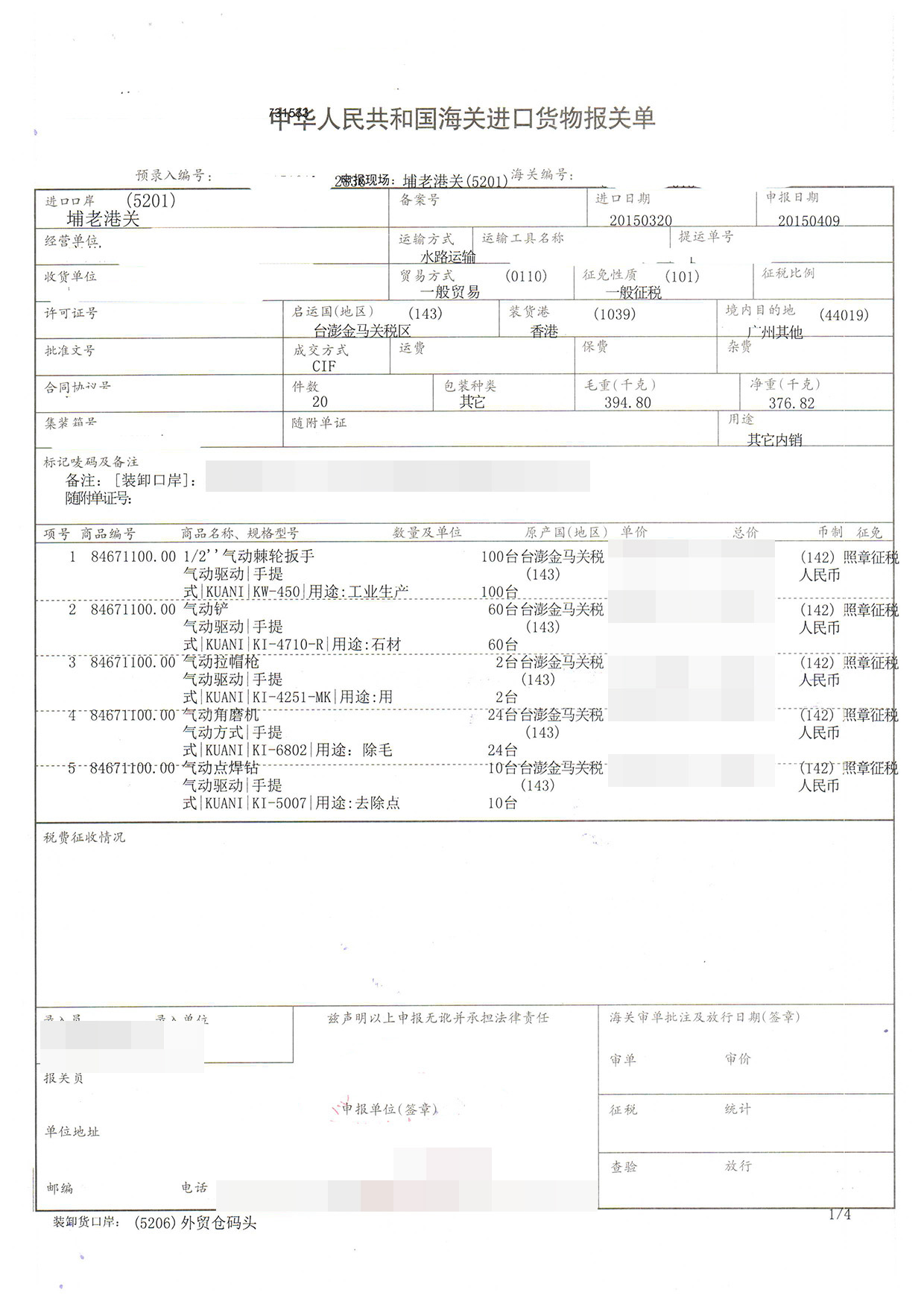 三、氣動工具進口報關案例展示