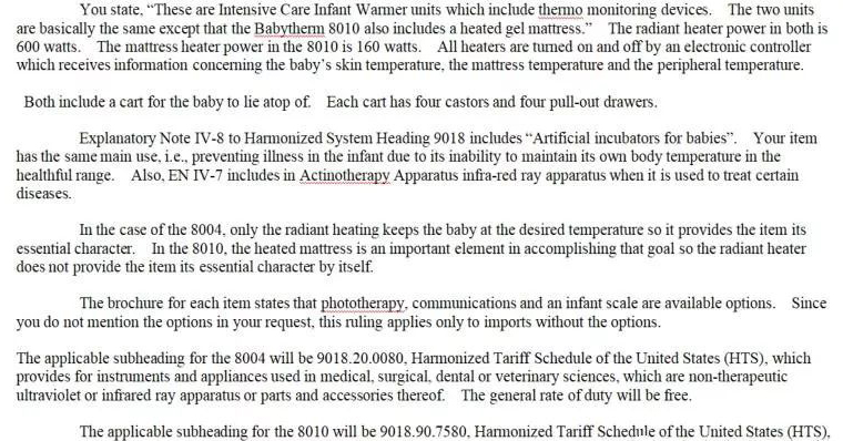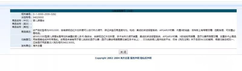 美國海關(guān)認(rèn)為:嬰兒保溫臺的主要功能與注釋品目90.18中的“嬰兒人工保溫箱”等醫(yī)療設(shè)備類似,目的為了防止嬰兒生病,應(yīng)按醫(yī)療設(shè)備歸入品目90.18。